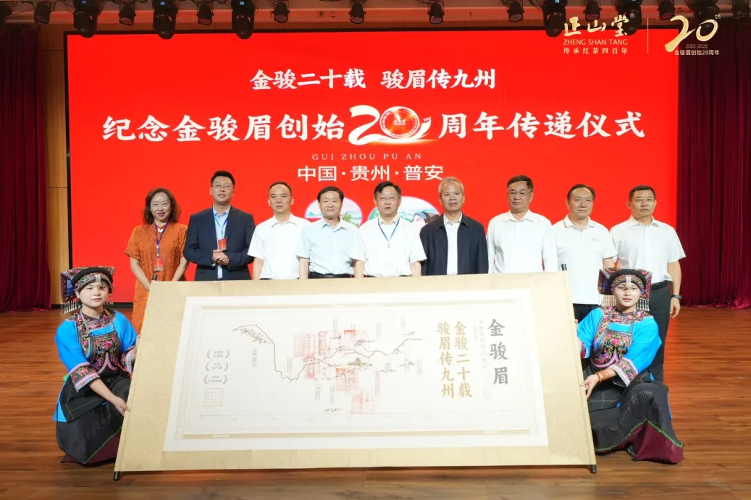 大会最后,现场举行了庄重而热烈的“金骏眉20周年纪念传递仪式·普安站”活动。在中国茶叶学会名誉理事长、中国农业科学院茶叶研究所党委书记江用文,中国保安协会常务副会长、秘书长华敬锋,黔西南州人民政府副州长龙强,海峡茶业交流协会副会长陈少和,贵州大学舆情与社会治理研究院院长、人民网原总编辑余清楚,黔西南州人大常委会原一级巡视员、黔西南州茶叶协会会长、省茶叶协会副会长黄健勇,武夷山市政协副主席、农工党武夷山市委会主委范青等人的见证下,普安县委书记、县人民政府县长黄其兴与福建正山堂茶业有限责任公司董事长江志东共同盖下印章,至此,金骏眉20周年纪念传递仪式全国卷轴传递至普安,象征着正山堂的创新精神与普安的古树茶韵在此交汇融合,开启了山海协作的新篇章。